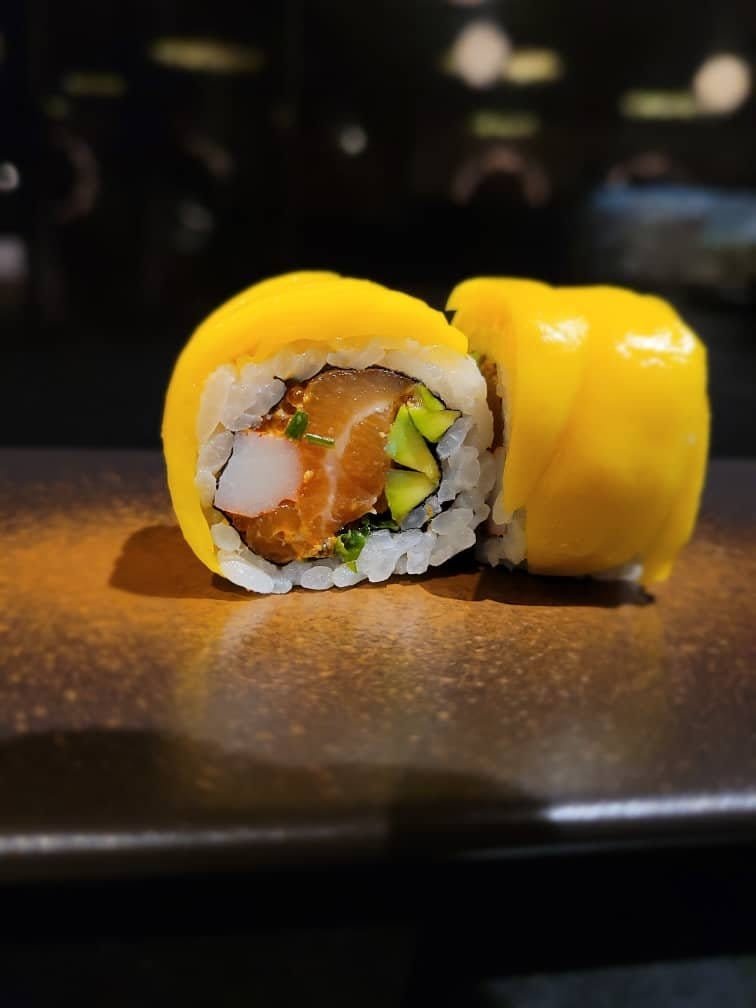 Saumon, crabe, avocat, ciboulette, mayo, sauce mangue