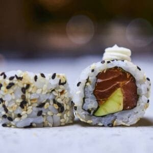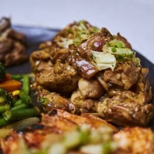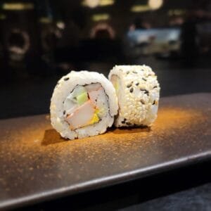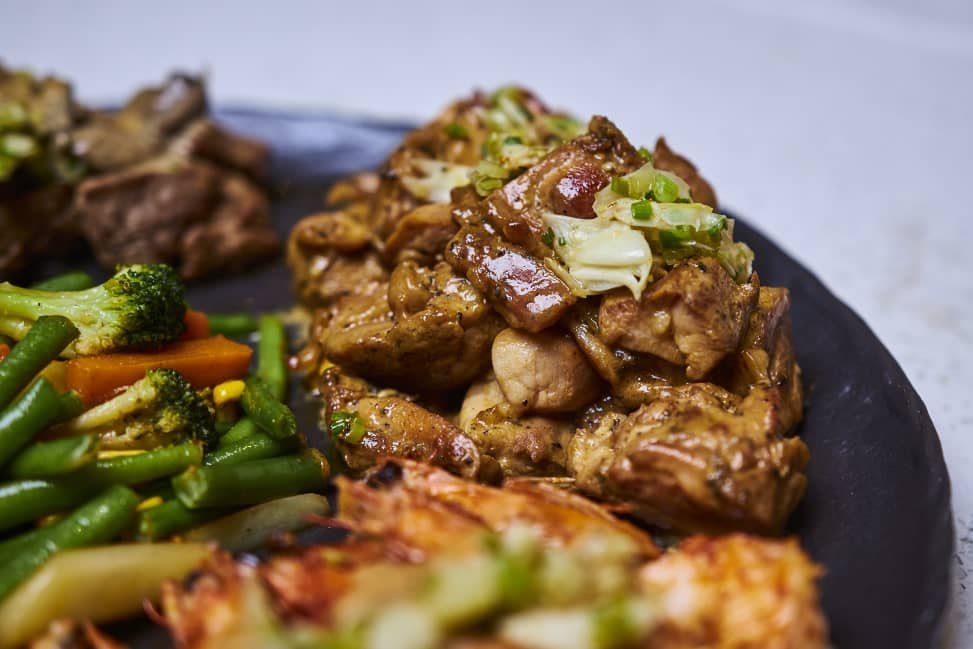 Poulet, Bœuf, Merou, Riz Cantonais, Mixed legumes, Miso soup, California Sesame, Dessert