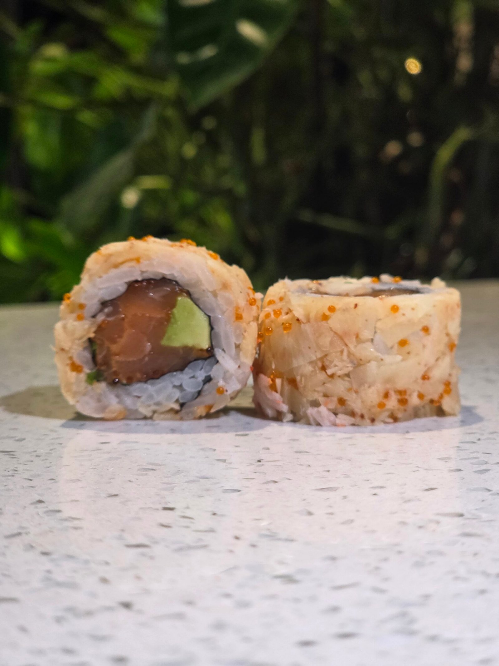 Salmon ,tobiko, togarashi, ciboulette, ginger wrap, teriyaki ,creamy sauce ,mango on the top